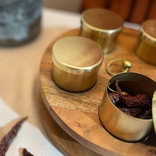 Introducing Kastleune Home’s exquisitely handcrafted Wooden Masala Box – where timeless design meets modern elegance. Made for homes that value both function and finesse, this luxurious spice box features 5 golden brass containers neatly nestled in a premium acacia wood rotating tray. A matching brass spoon is thoughtfully included to elevate your everyday cooking rituals with grace and ease.