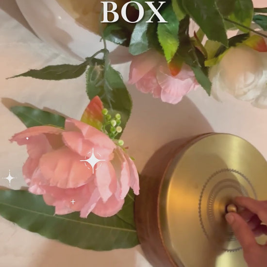 - Material: High-quality mango wood with brass-finish metal lid & tong